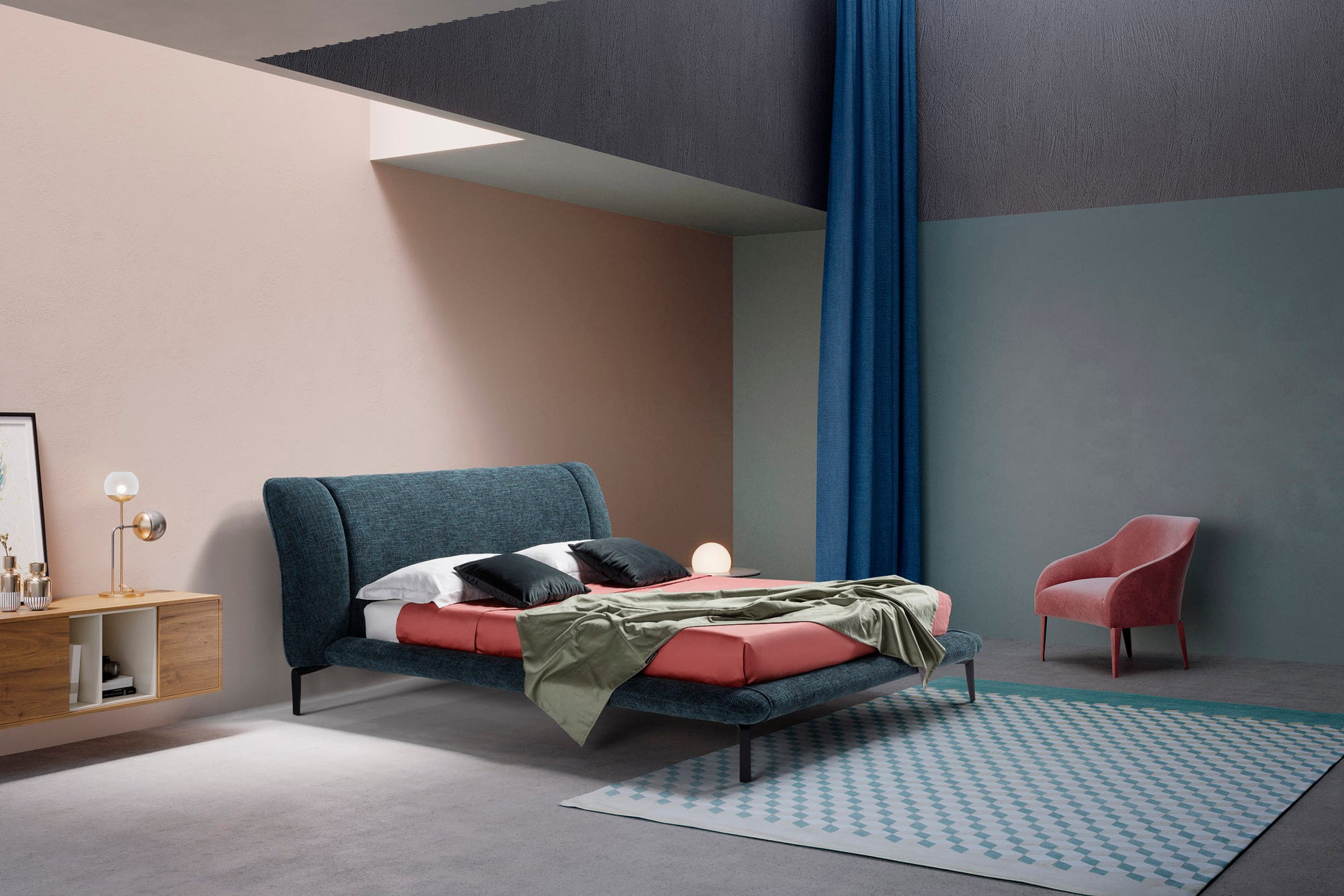 Cedric stands out for its minimalist structure and slightly curved headboard, adding a touch of sophistication to any bedroom. Vertical seams divide the headboard for visual rhythm, while the slim base conveys lightness and modern appeal.