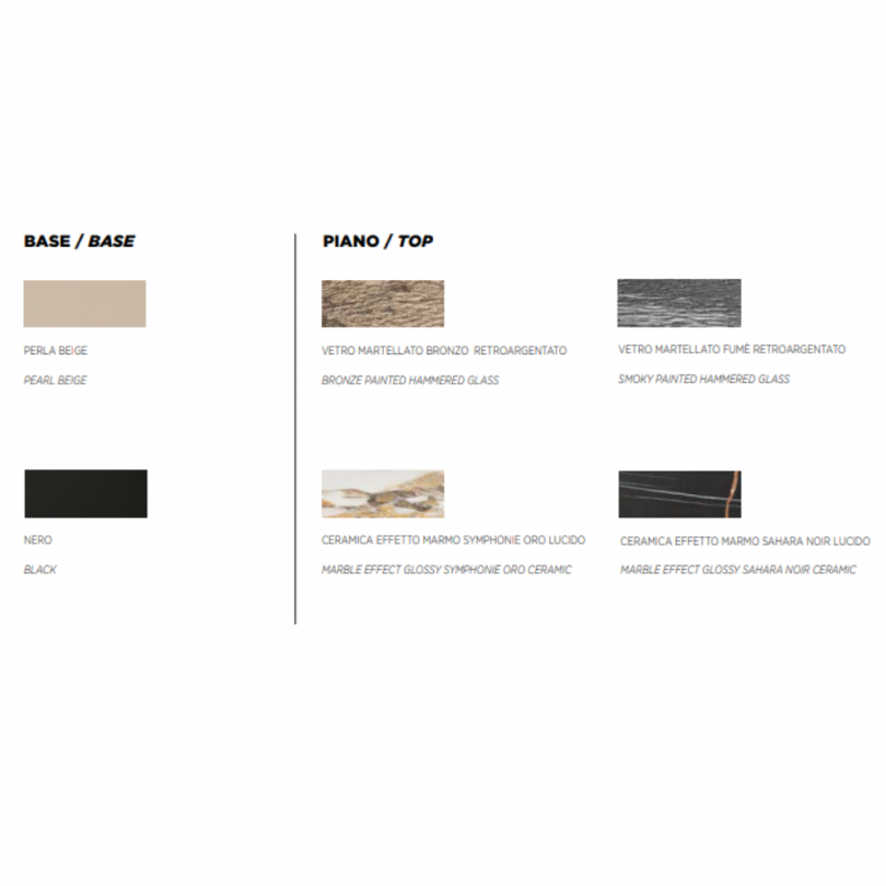 Console table with a black or pearl beige painted metal base. Two top options: hammered glass with a silvered finish or marble-effect ceramic layered on glass.